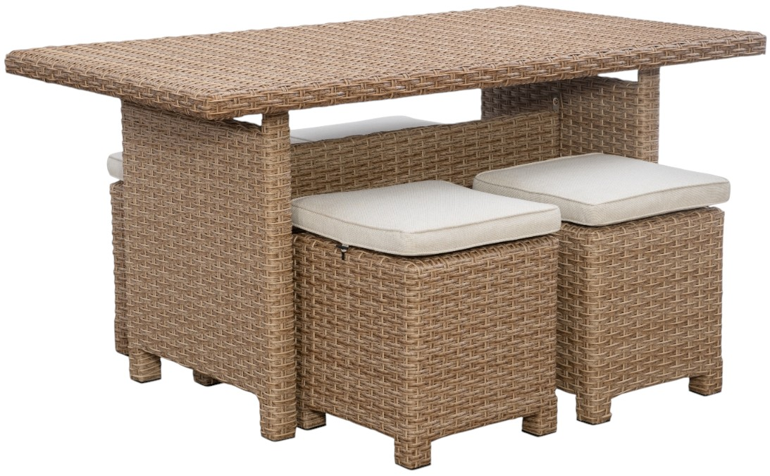 This 5-piece dining table set includes a spacious rectangular table and four coordinating stools, designed for both comfort and durability. Built with a rust-proof, powder-coated aluminum frame and hand-woven weather-resistant wicker, it’s ideal for indoor or outdoor dining with added cushioned comfort.Read More