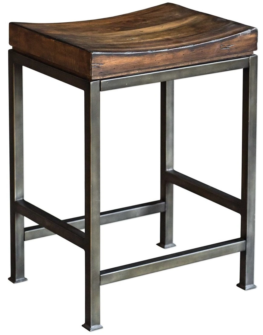 Constructed of solid hardwood, finished in a lightly burnished dark walnut revealing warm honey undertones, set atop an industrial iron base finished in a lightly brushed steel.