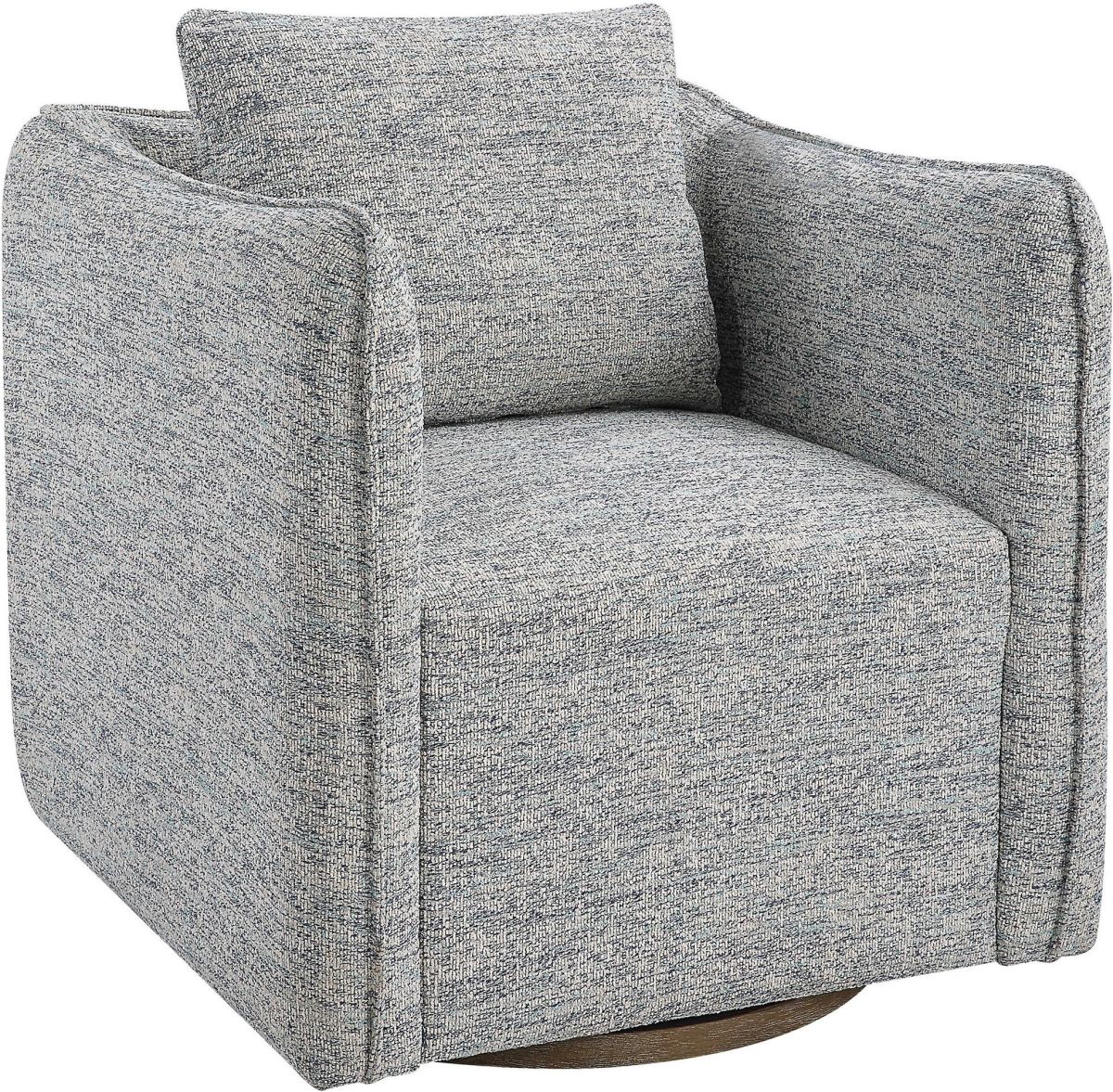 Casual shelter arm accent chair tailored in a casual blue and white tweed fabric. Features a flanged edge trim complete with a loose back pillow. Rests on a solid birch wood swivel base, finished in a weathered gray stain. Seat height is 19".Read More