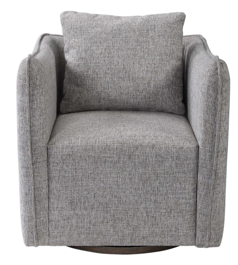 Casual shelter arm accent chair tailored in a woven linen blend fabric in natural stone hues, featuring a flanged edge trim complete with a loose back pillow. Rests on a solid birch wood swivel base, finished in a weathered gray stain. Seat height is 19".