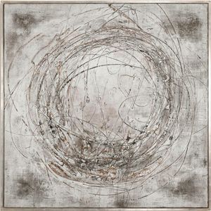 Adorn any wall with this eye-catching, hand painted abstract on canvas. Rich, metallic leaf accents are balanced by a refined, soft gray and white palette. The canvas, with dimensional accents, is stretched over wooden stretchers and encased in a wooden frame with a champagne silver finish.Read More